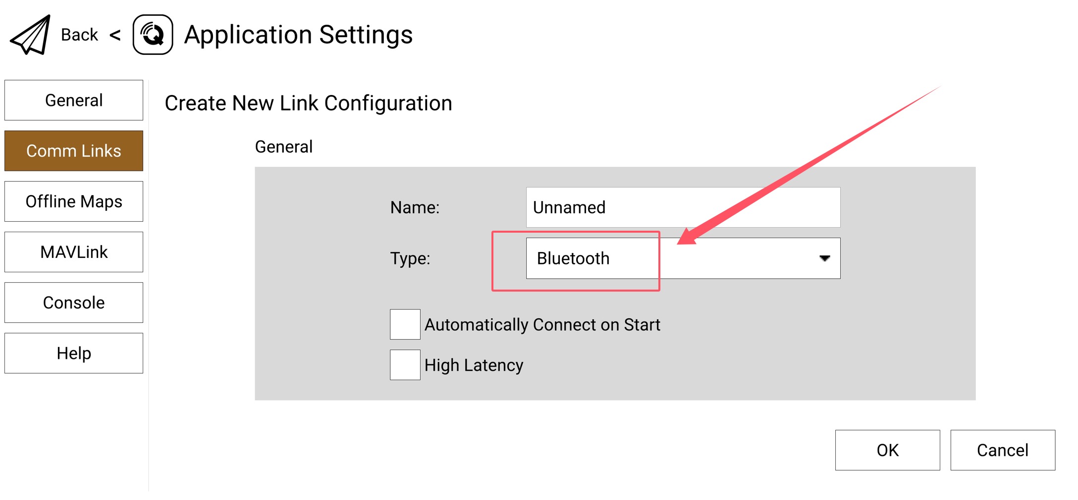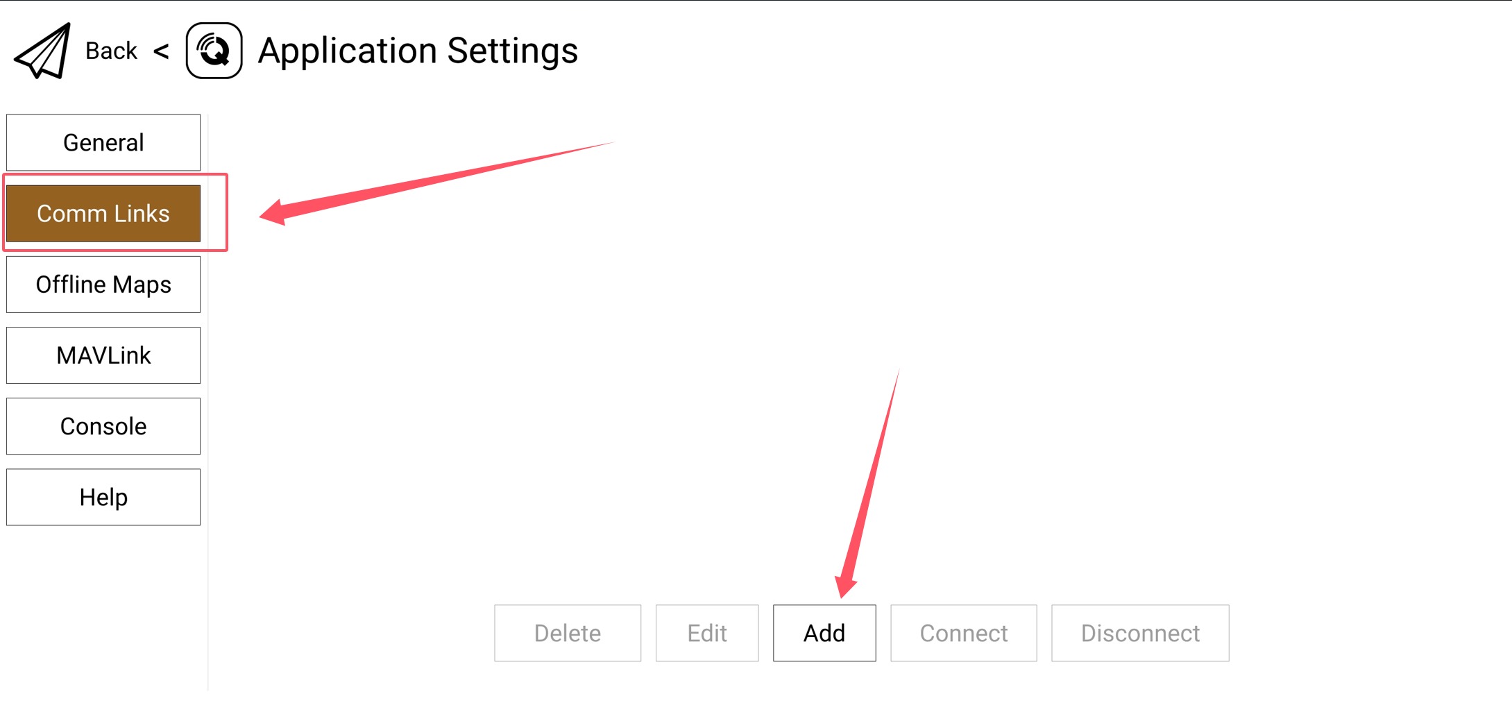 打开QGC APP,进入应用设置页面(Applicaition Settings),选择Comm links选项,然后点击“Add”添加连接