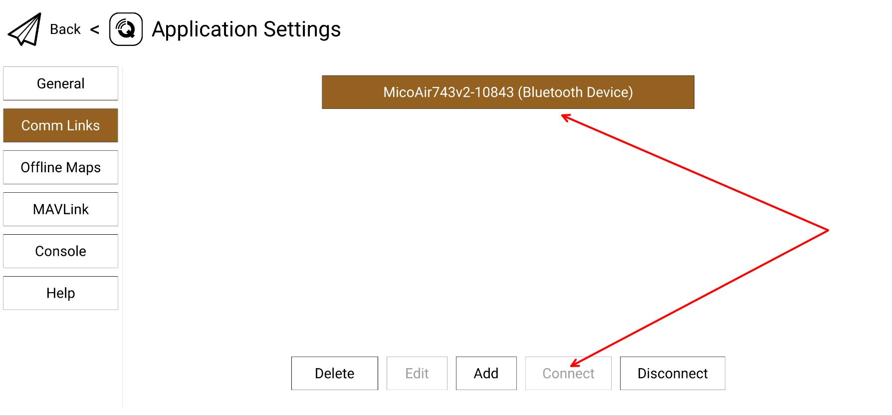 蓝牙设备添加完毕,在Comm Links界面选中刚添加的蓝牙设备,点击下方Connect。等待数秒,蓝牙连接成功后,飞控上的绿色蓝牙状态指示灯将会常亮。