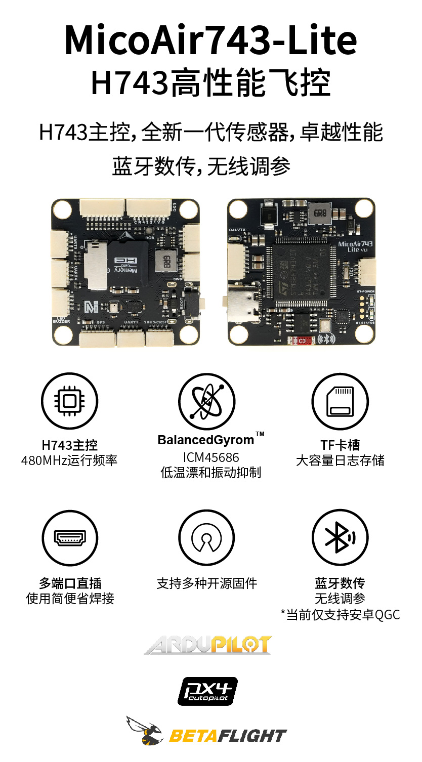 MicoAir743-Lite支持Ardupilot、PX4、Betaflight多种开源飞控固件,INAV固件暂未支持。