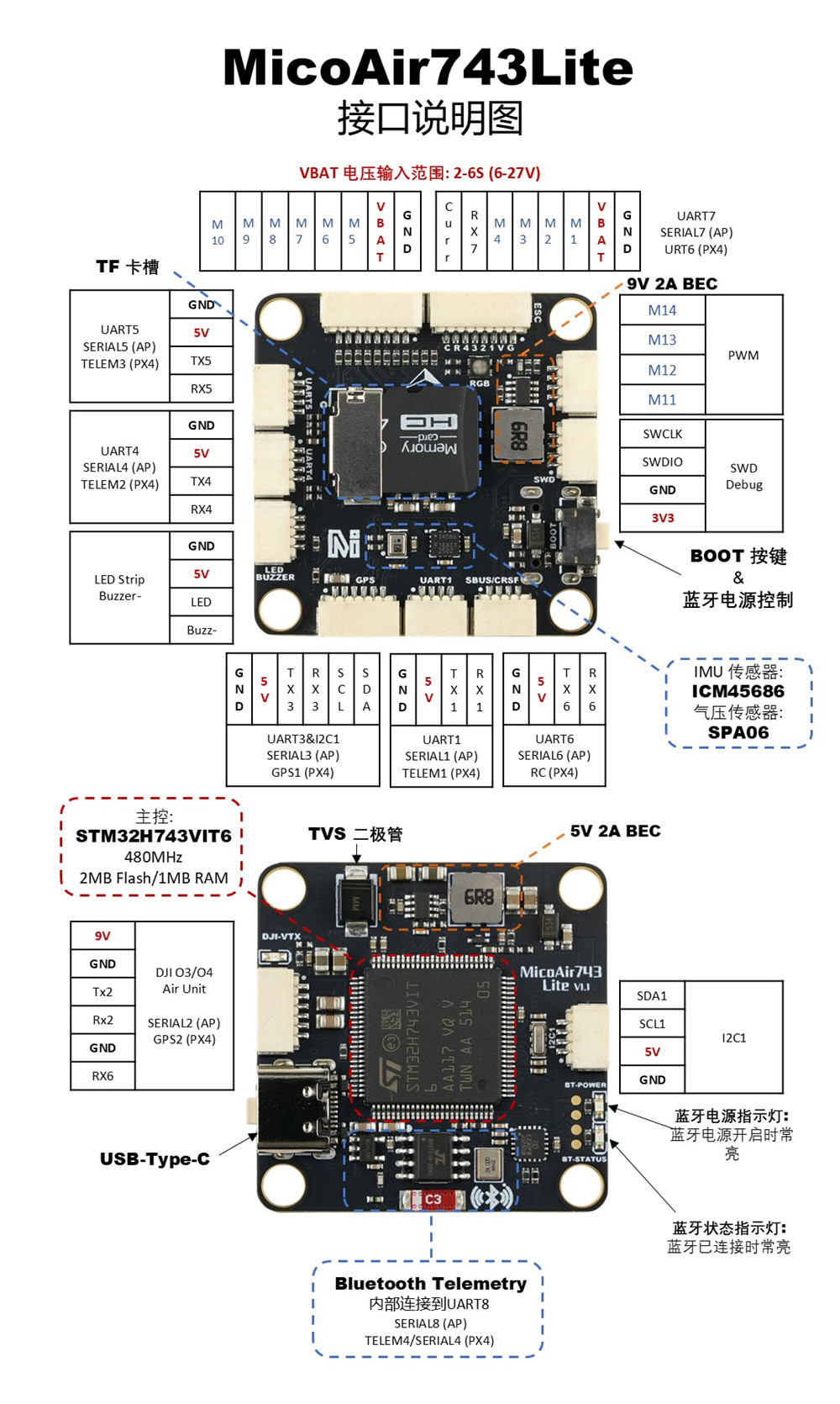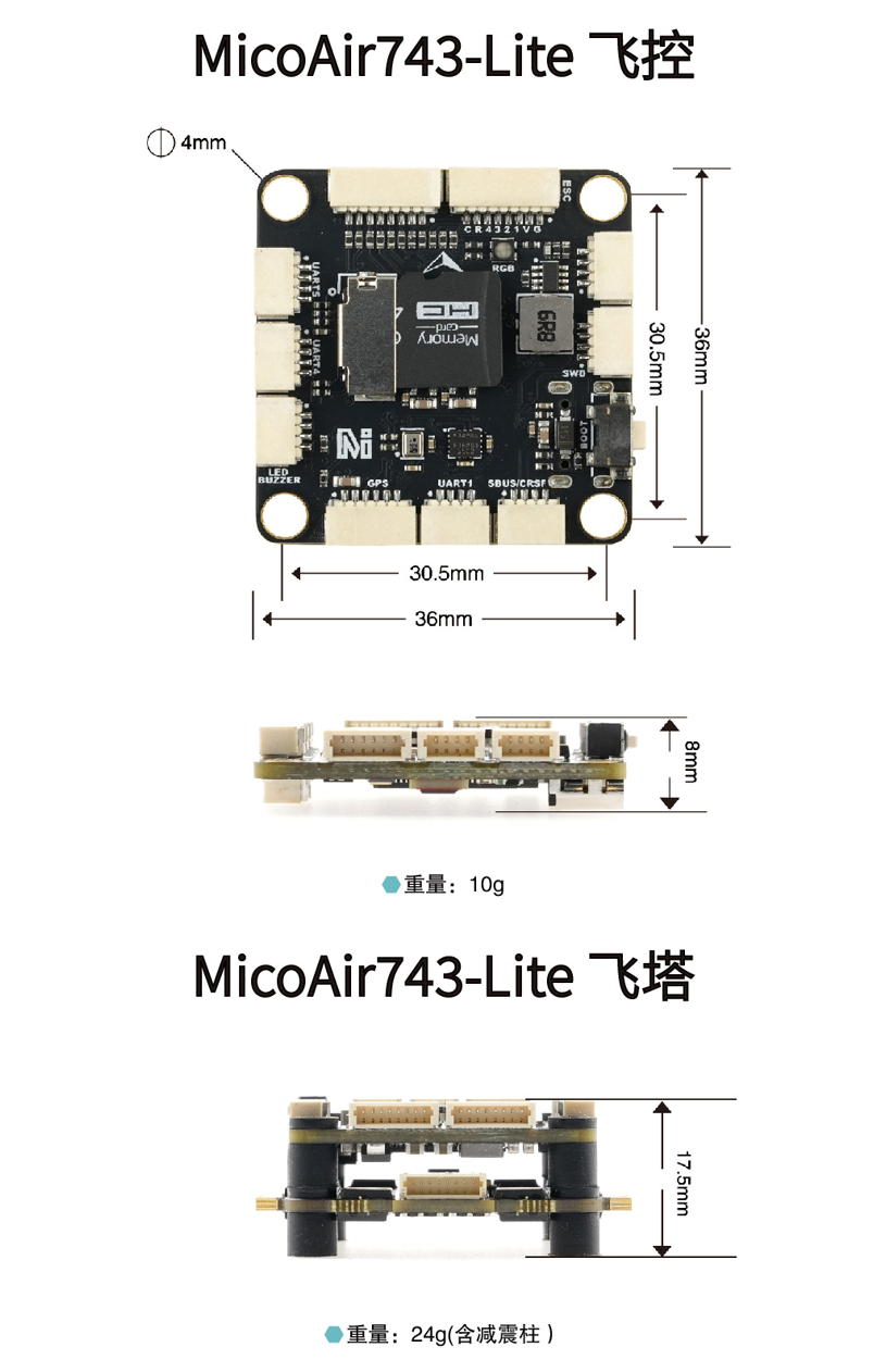 MicoAir743-Lite是由微空科技设计并生产的全新一代高性能轻量级飞控,采用480M主频的STM32H743主控,ICM45686IMU传感器,并板载SPA06气压计。