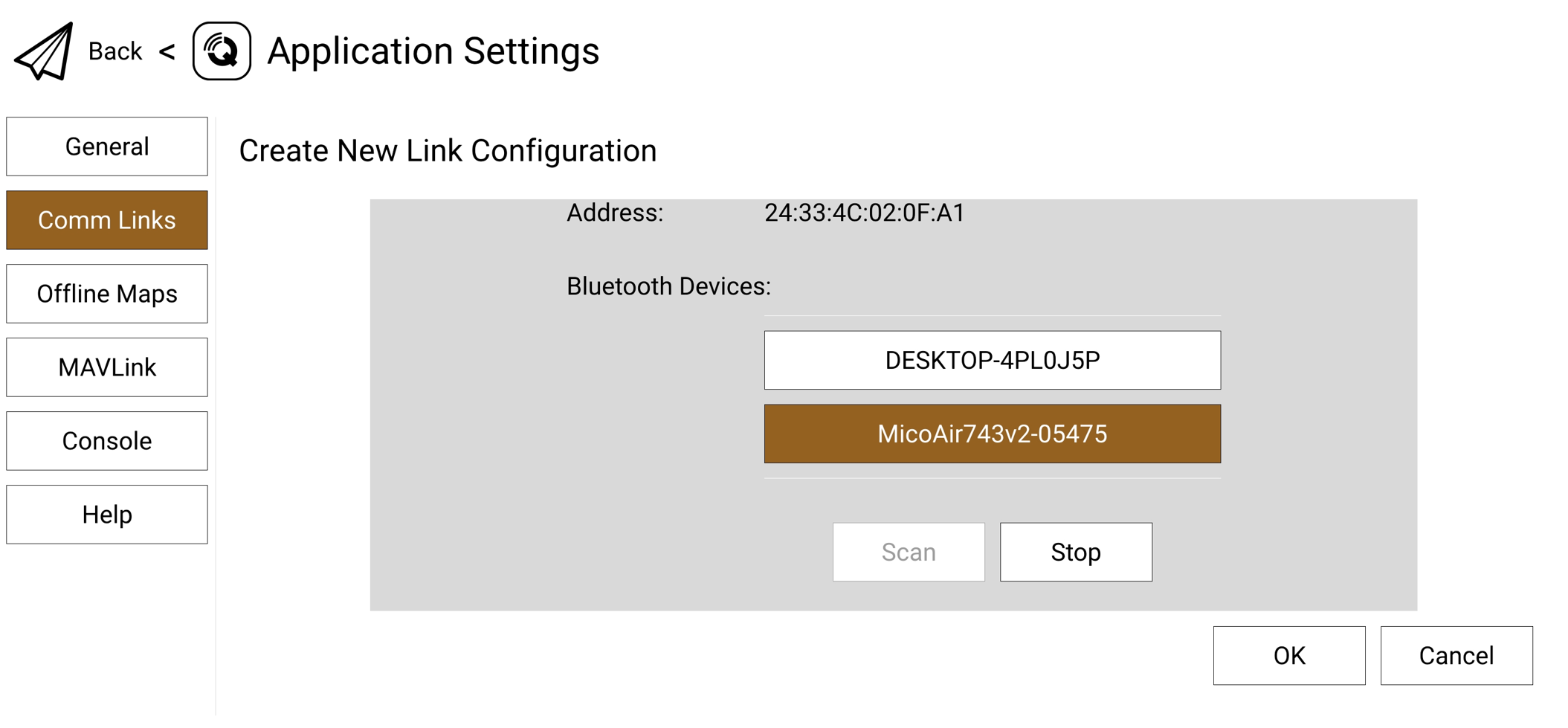 页面下拉,点击“Scan"扫描蓝牙设备,手机靠近飞机(飞控),飞控蓝牙设备名称为:“MicoAir743v2-xxxxx",点击选中这个设备,然后点击OK。
