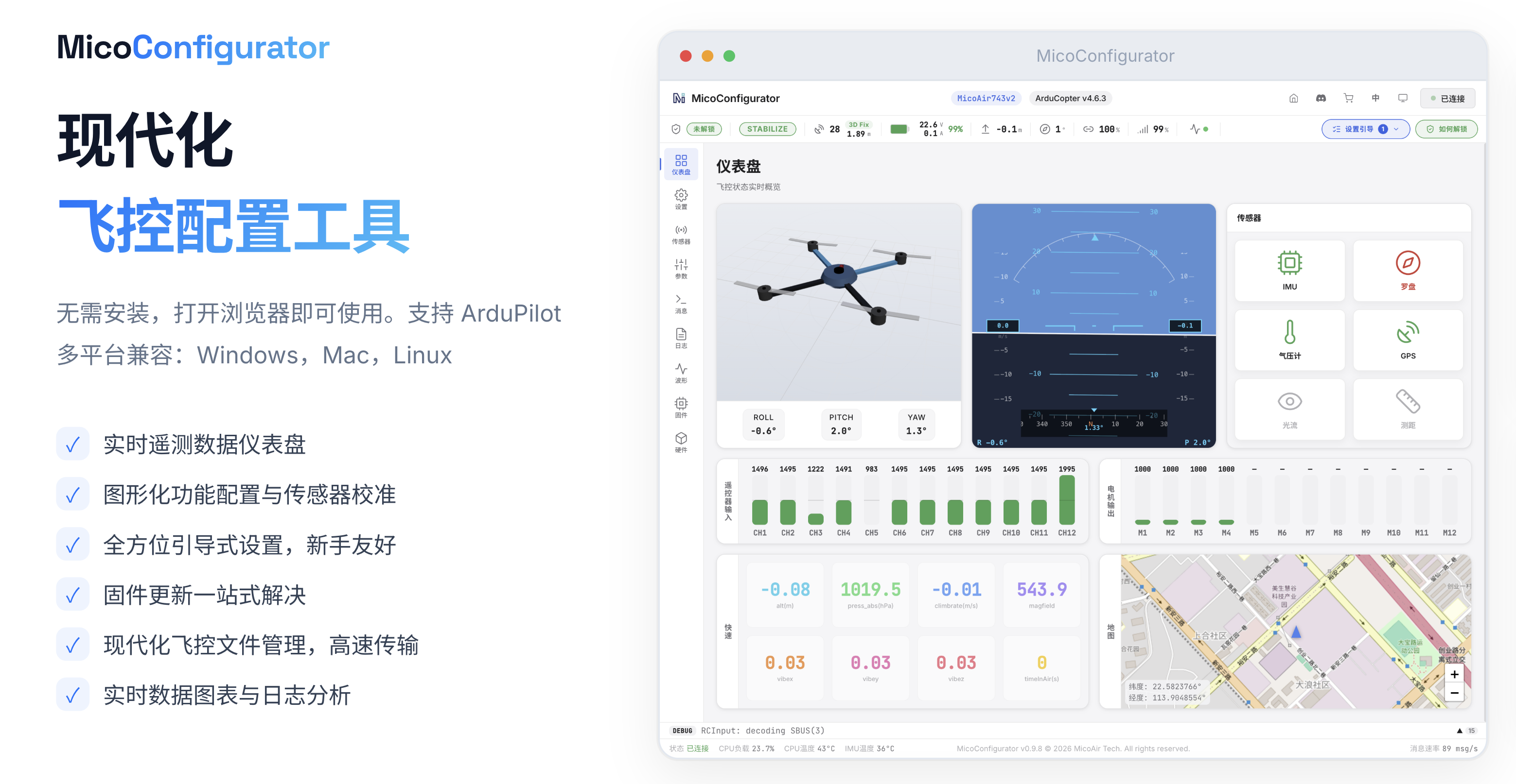 支持Ardupilot、PX4、Betaflight、INAV四大开源飞控固件。