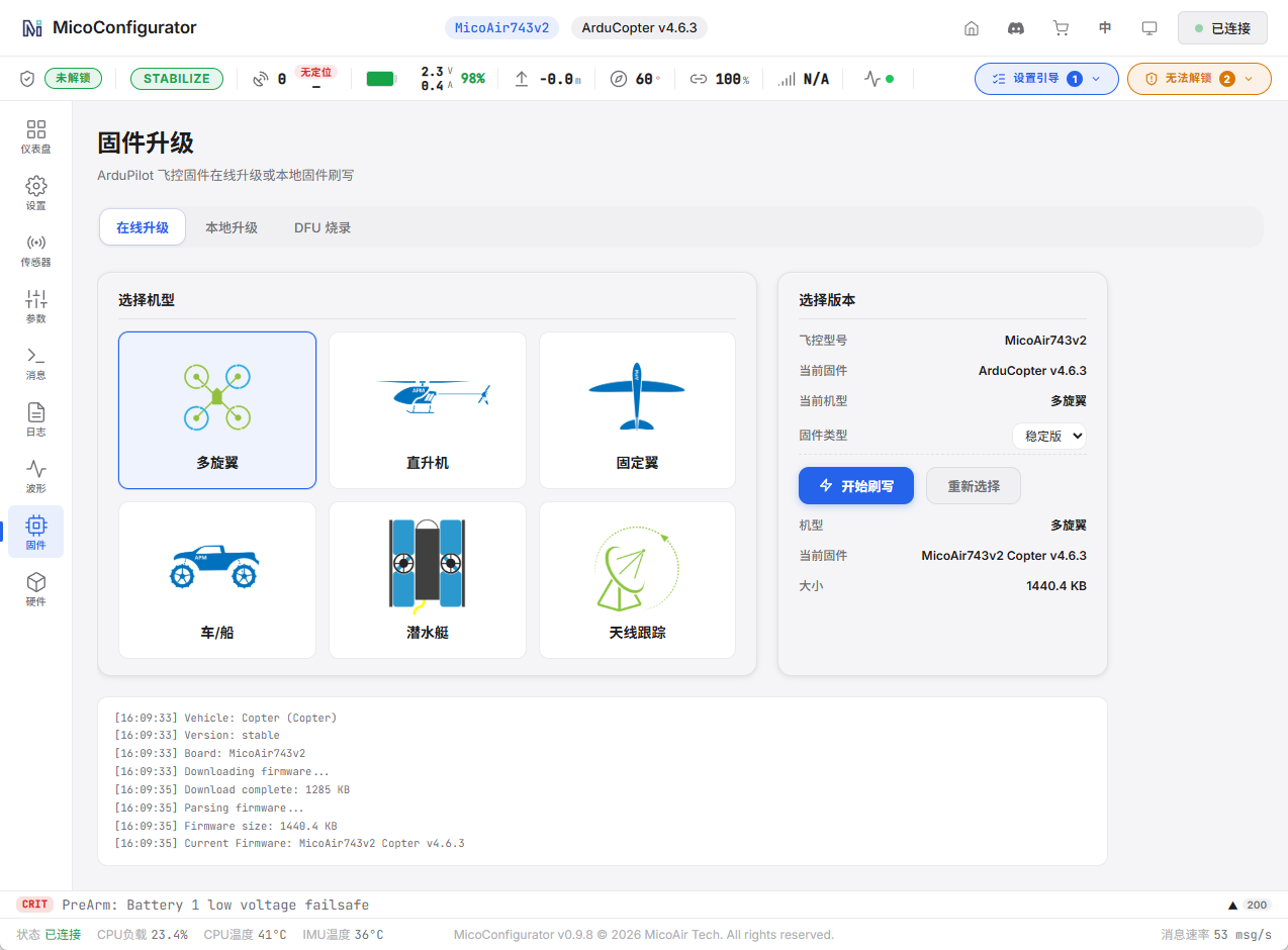 打开Firmware-flasher页面,左上角选择板子型号:MicoAir743/MicoAir405v2等,下拉框中选取要烧录的固件版本。