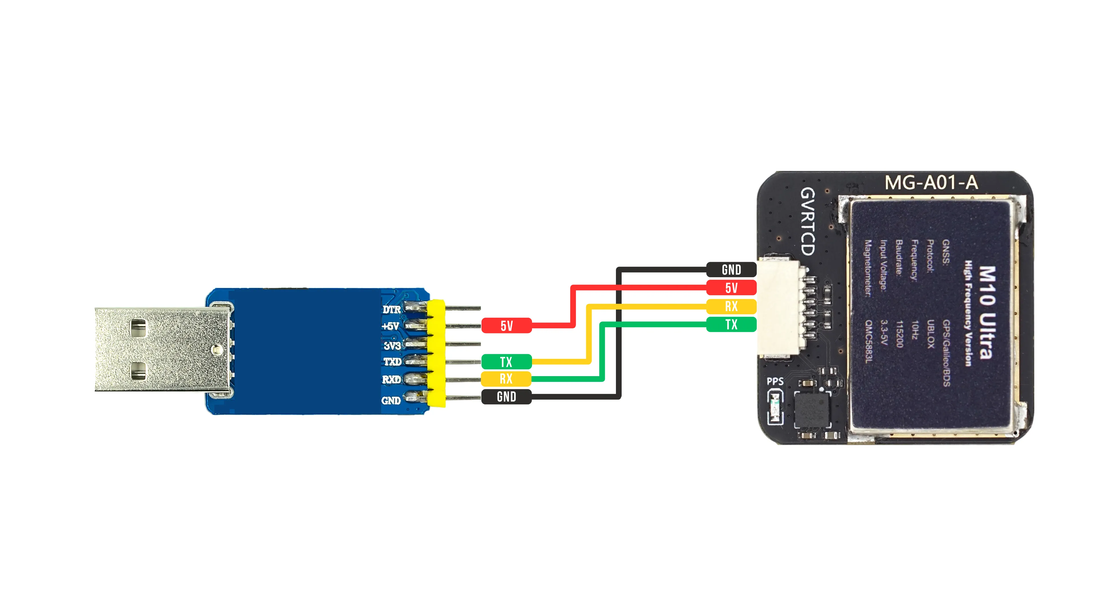 使用 USB 转 TTL 模块连接 GPS 时,必须遵循 交叉接线 原则 :