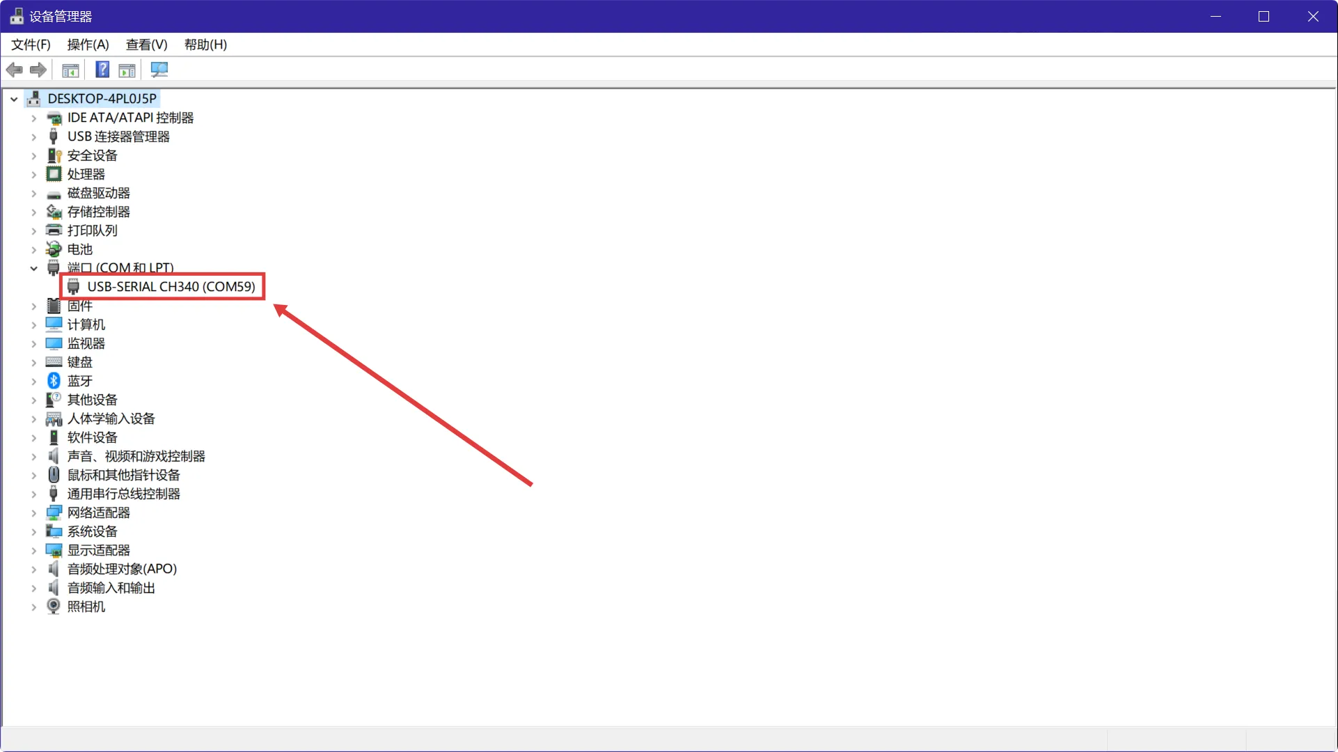 连接电脑后,请进入 Windows 设备管理器 -> 端口 (COM 和 LPT),确认设备已被识别并记下 COM 端口号(例如 COM59) 。