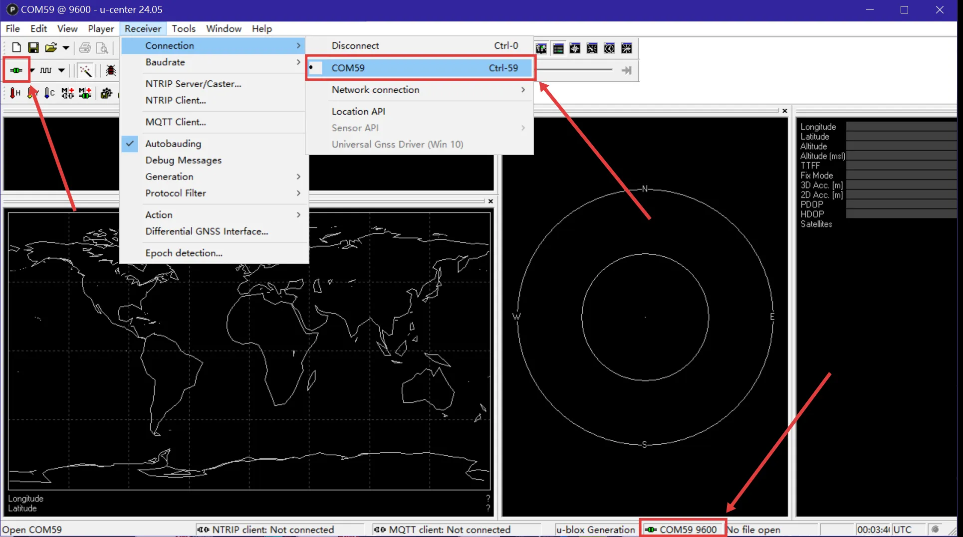点击 Receiver -> Connection -> 选择对应的 COM 端口 。