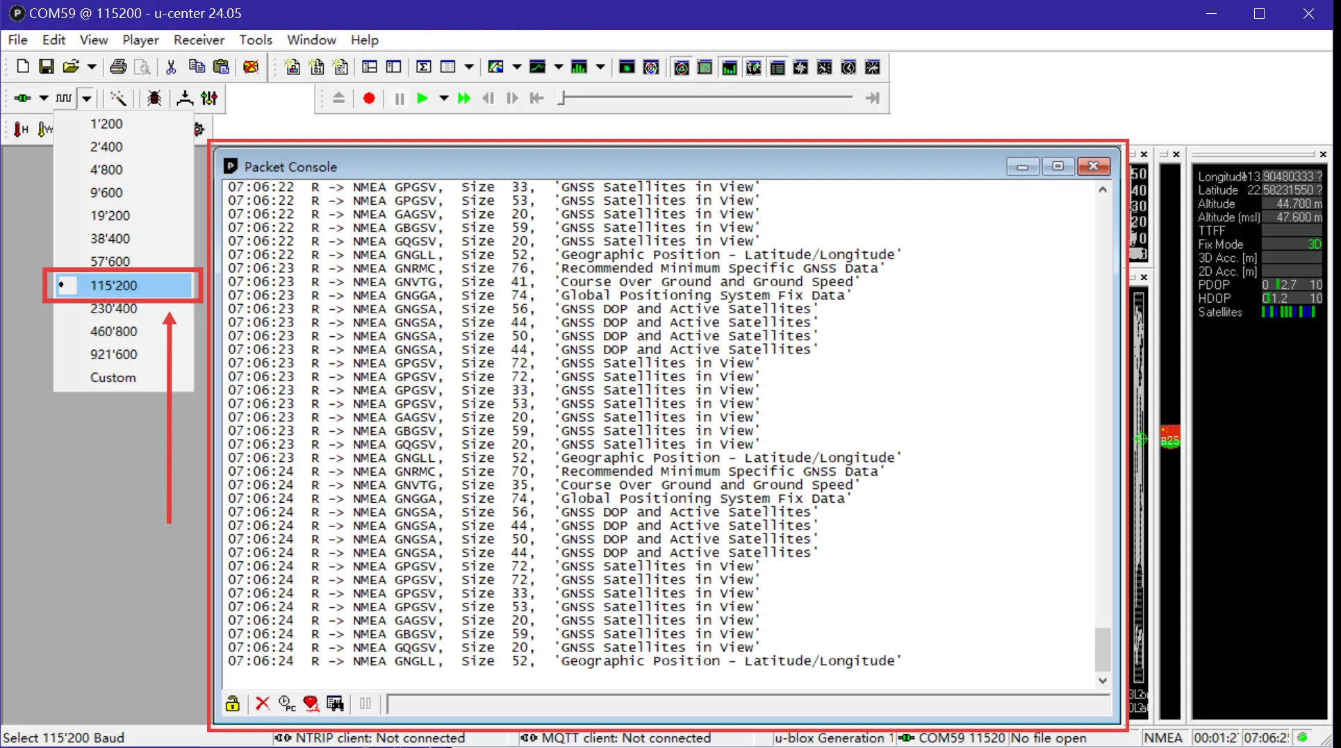在顶部工具栏的波特率选择框中,手动选择与 步骤二 中获取的 GPS 波特率一致的数值(例如 38400)。