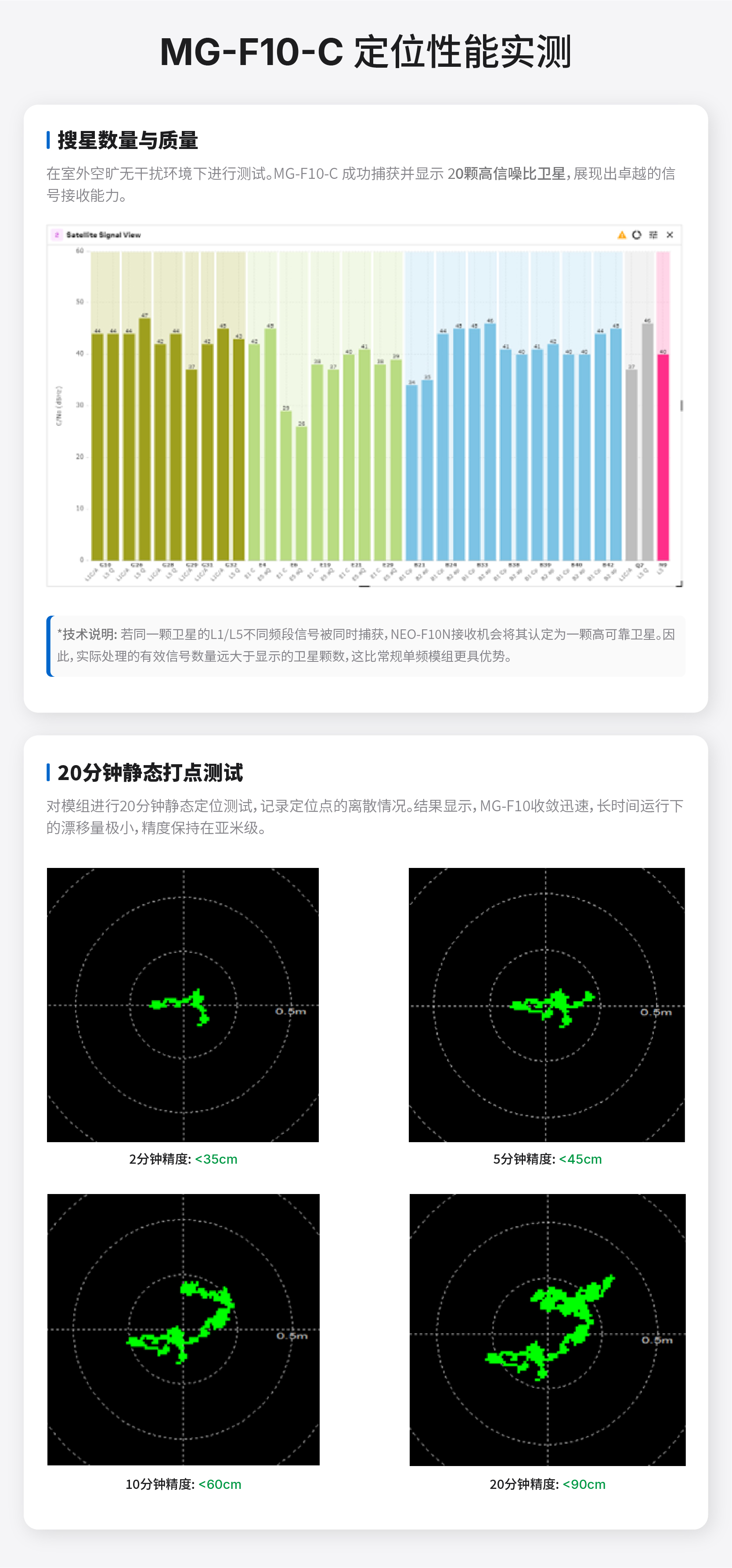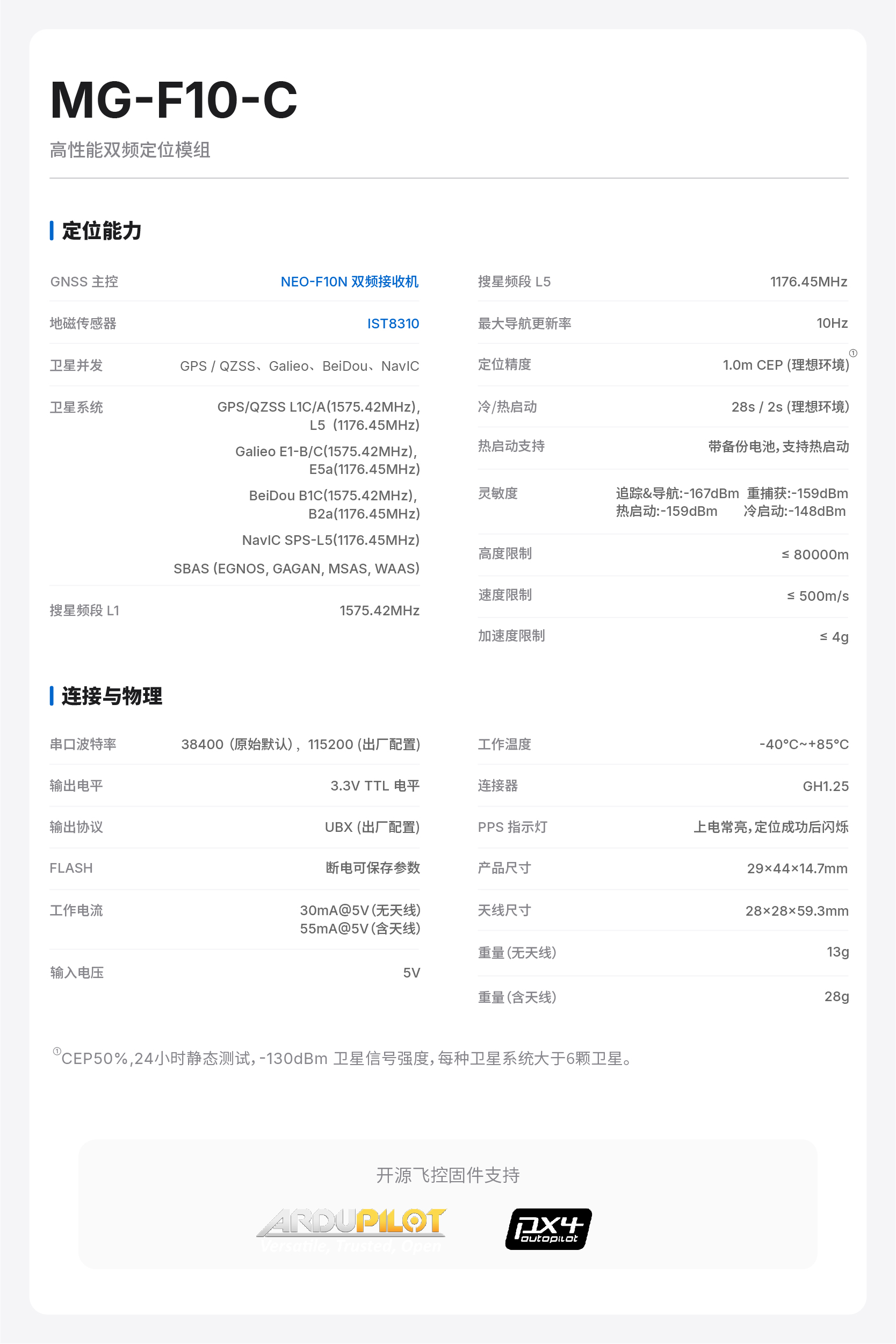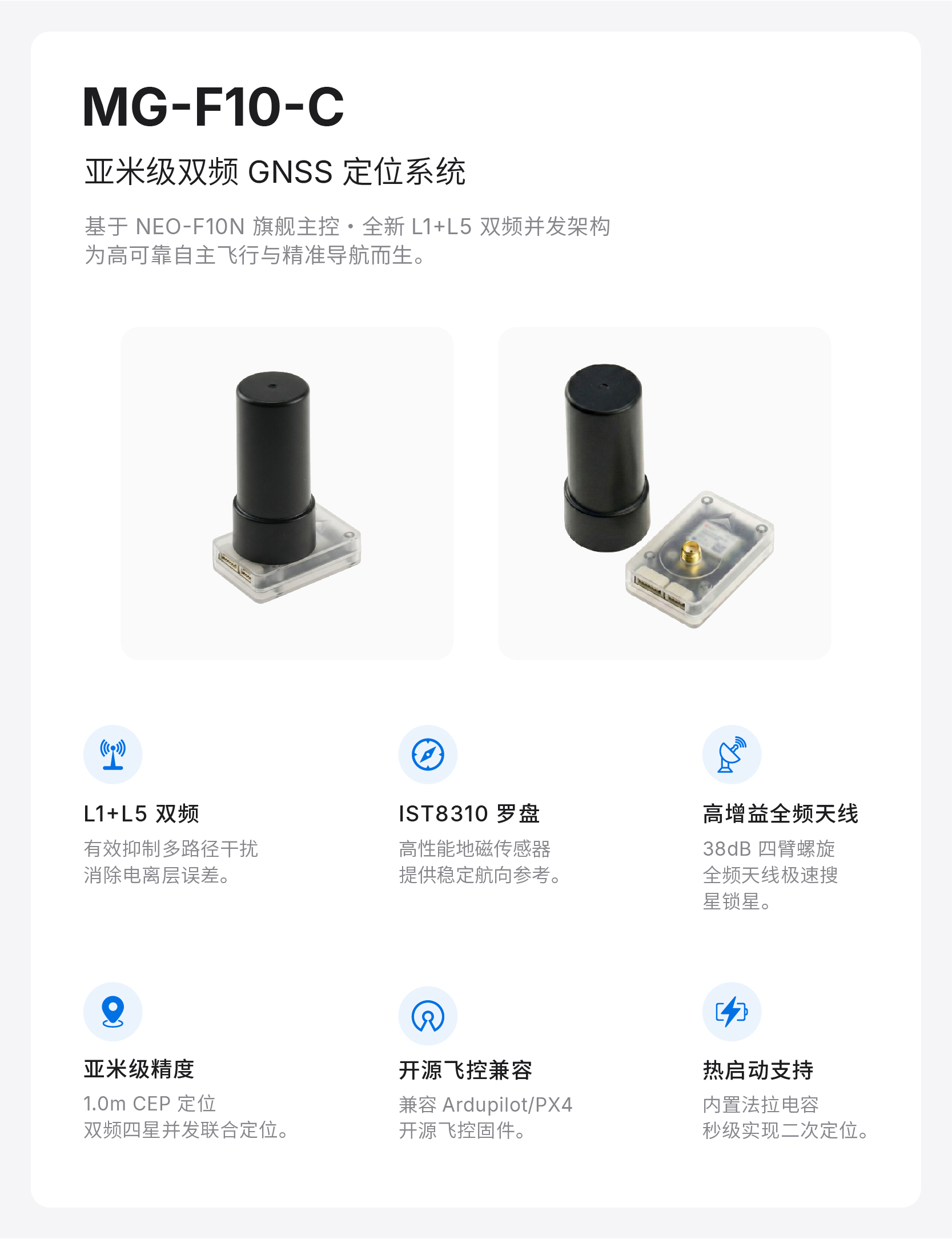 MG-F10-C是微空科技专为无人机应用开发的最新一代双频GNSS定位模组,模组采用Ublox最新一代NEO-F10N双频接收机和全频段高增益四臂螺旋天线,可以支持GPS/北斗/Galileo/NaVIC四星双频L1+L5联合定位,从而获得了当下GNSS产品中除了RTK差分定位以外的最佳定位性能,极其适合各类对定位精度、速度精度要求高的多旋翼/固定翼无人机产品使用。